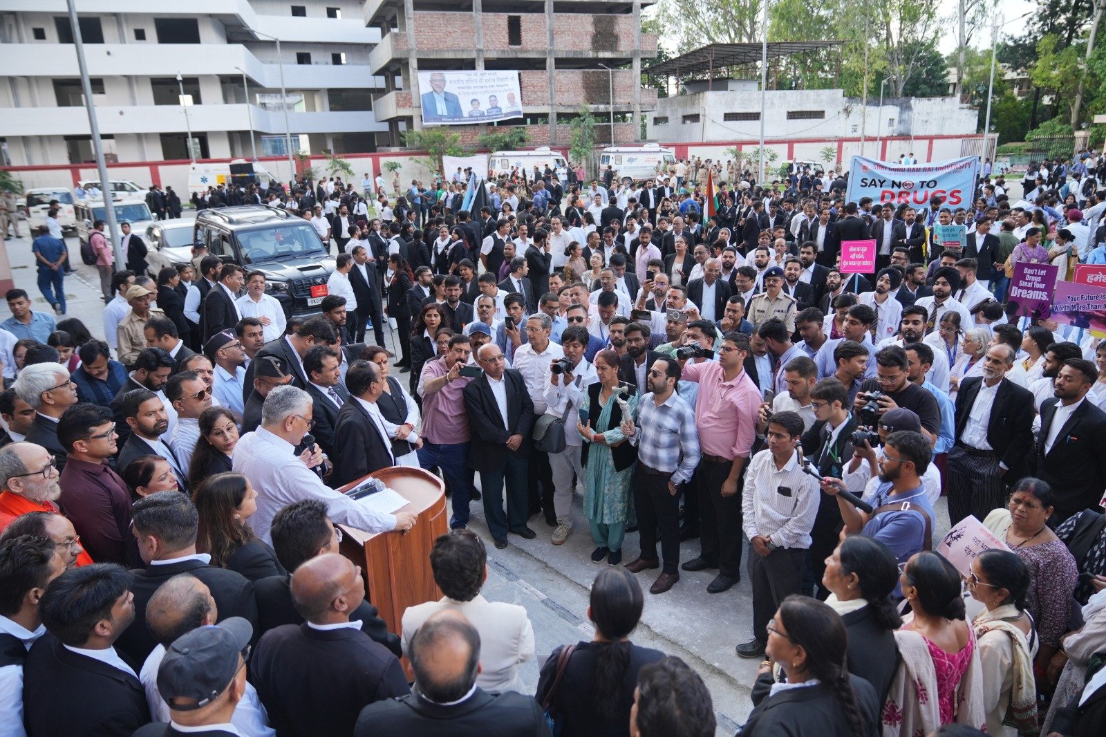 बार एसोएिशन देहरादून की ओर से आहुत इस विशाल रैली में श्री गुरु राम राय विश्वविद्यालय से करीब दो हजार छात्र-छात्राओं और फैकल्टी सदस्यों ने भाग लेकर समाज को नशा छोड़ने का संदेश दिया। रैली में देहरादून बार एसोसिएशन, वकीलों, विभिन्न सामाजिक संगठनों एवं दूनवासियों ने प्रतिभाग किया। जिला न्यायालय परिसर से देहरादून में उत्तराखंड हाईकोर्ट नैनीताल के माननीय न्यायाधीश जस्टिस मनोज तिवारी एवं बार एसोसिएशन देहरादून के अध्यक्ष मनमोहन कंडवाल ने हरी झंडी दिखाकर रवाना किया। जिला न्यायालय परिसर से प्रारम्भ होकर गांधी पार्क पर जाकर रैली सम्पन्न हुई ।