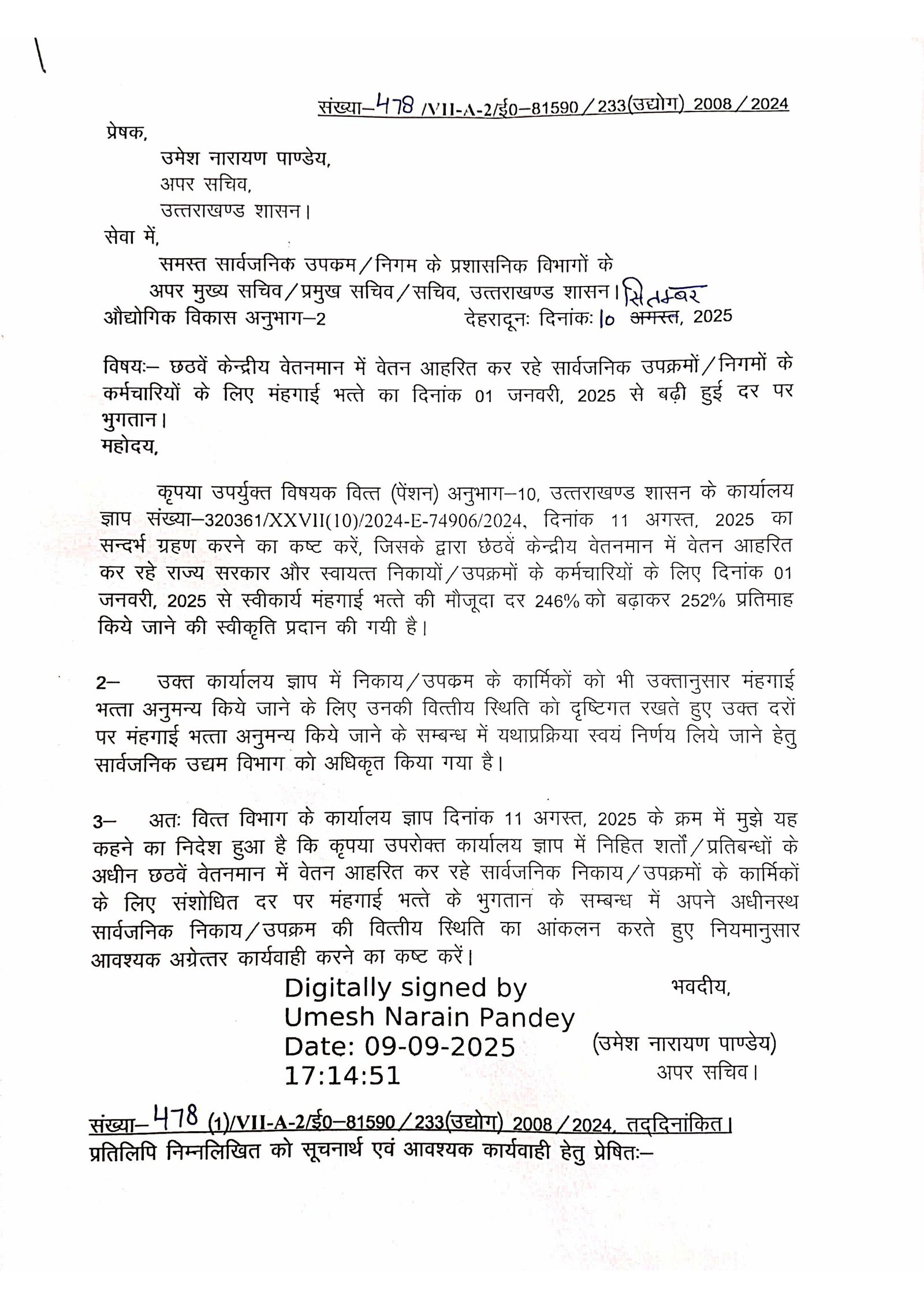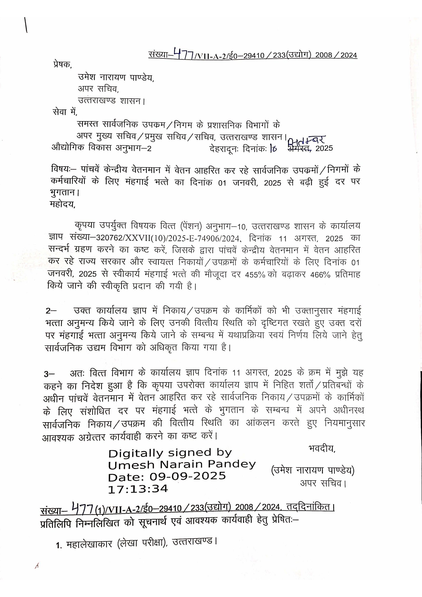 राज्य निगम कर्मचारी महासंघ, उत्तराखण्ड की पहल पर राज्य के विभिन्न निगमों, सार्वजनिक उपक्रमों एवं स्वायतशासी संस्थाओं में कार्यरत सभी कर्मचारियों के हित में एक ऐतिहासिक निर्णय लिया गया है। सरकार ने पांचवे/छठवें केन्द्रीय वेतनमान के तहत 11 प्रतिशत महंगाई भत्ते (डीए) का शासनादेश जारी किया है। इस महत्वपूर्ण निर्णय के लिए राज्य निगम कर्मचारी महासंघ ने मुख्यमंत्री पुष्कर सिंह धामी के प्रति हार्दिक आभार व्यक्त किया है। महासंघ का कहना है कि इस निर्णय से हजारों कर्मचारियों को सीधा आर्थिक लाभ मिलेगा और उनके जीवन स्तर में सुधार होगा। यह शासनादेश लंबे समय से चली आ रही कर्मचारियों की मांग को पूरा करने वाला कदम है।