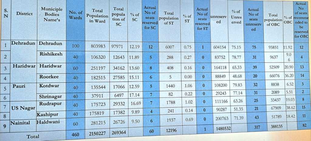 देहरादून: एकल सदस्यीय समर्पित आयोग के अध्यक्ष बी एस वर्मा ने प्रदेश भर के नगर निकायों का सर्वे पूरा कर शासन को अपनी रिपोर्ट सौंप दी है व शासन ने भी इस रिपोर्ट को स्वीकार कर लिया है। रिपोर्ट की माने तो आगामी नगर निकाय चुनाव अब नए तय किये गए आरक्षण के अनुसार होगा।