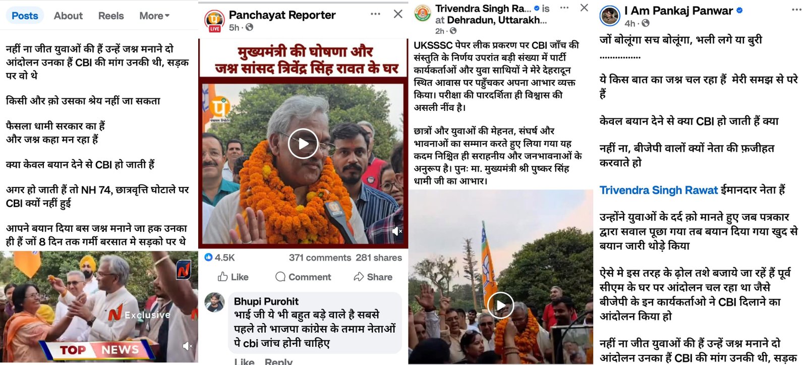 वहीं इसके बाद शुरू हुई श्रेय लेने की होड़। एक के एक कई नेताओं ने सोशल मीडिया के जरिये ये बात कही कि उन्होंने मुख्यमंत्री से मिलकर CBI जांच कराने की बात कही थी। यहीं नहीं पूर्व CM व हरिद्वार सांसद त्रिवेंद्र सिंह रावत के घर तो बड़ी संख्या में कार्यकर्ता पहुँचे। जमकर आतिशबाजी हुई, मिठाइयां बांटी गई। जिसके बाद कि सवाल उठते हैं। CBI जांच की मांग किसने की.? बेरोज़गार संगठन के बैनर तले युवाओं ने। आंदोलन किसने किया.? उन्हीं बेरोजगार युवाओं ने आठ दिन तक धूप, बारिश और त्योहारी सीजन की गर्मी में सड़कों पर कौन डटा रहा.? फिर से वही बेरोजगार युवा। लेकिन जश्न किसके घर पर मनाया गया..? पूर्व मुख्यमंत्री त्रिवेंद्र सिंह रावत के।