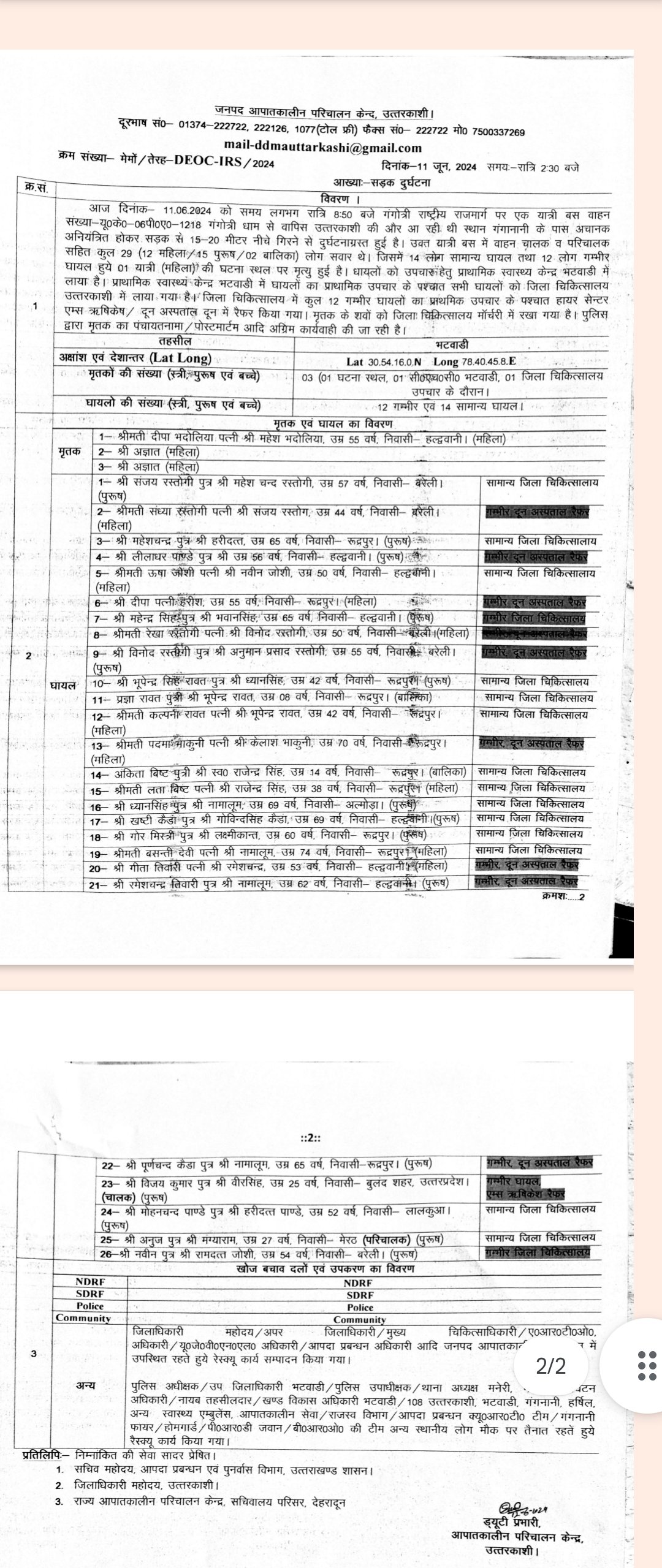 उत्तरकाशी : गंगोत्री राष्ट्रीय राजमार्ग पर कल रात को एक यात्री बस वाहन संख्या-UK06 PA-1218 गंगोत्री धाम से वापस उत्तरकाशी की और आ रही थी। गंगानानी के पास अचानक अनियंत्रित होकर सड़क से 15-20 मीटर नीचे गिरने से दुर्घटनाग्रस्त हो गई। है। बस में वाहन चालक व परिचालक सहित कुल 29 (12 महिला 45 पुरुष/02 बालिका) लोग सवार थे। जिसमें 14 लोग सामान्य घायल और 12 लोग गम्भीर घायल हुए। हादसे तीन लोगों की मौत हो गई। प्राथामिक स्वास्थ्य केन्द्र भटवाडी में लाया है। प्राथामिक स्वास्थ्य केन्द्र भटवाडी में घायलों का प्राथामिक उपचार के पश्चात सभी घायलों को जिला चिकित्सालय उत्तरकाशी में लाया गया है। जिला चिकित्सालय में कुल 12 गम्भीर घायलों का प्राथमिक उपचार के पश्चात हायर सेन्टर एम्स ऋषिकेष / दून अस्पताल दून में रैफर किया गया।