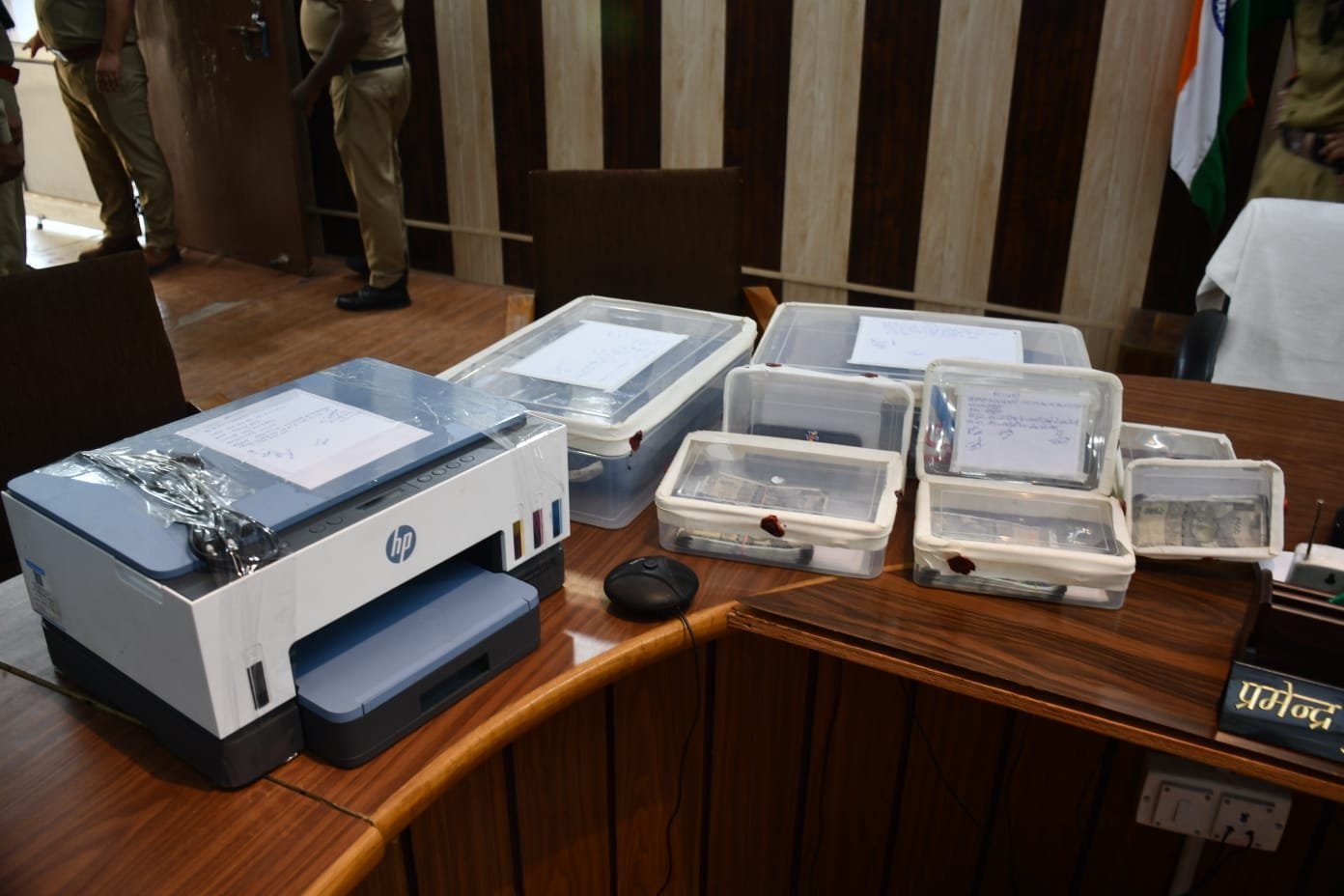 • 02 बाइक(01 प्लसर ,01 ड्यूक), 02 लैपटॉप एचपी कम्पनी, 02 प्रिन्टर इंक जेट एचपी कम्पनी, 04 कटर, 02 केंची ,01 पेपर कटर , 03 कटर , 05 चमकीली ग्रीन टेप, 01 पैन ड्राईव व नोट बनाने का सामान, कटिंग करने के बाद शेष कतरन