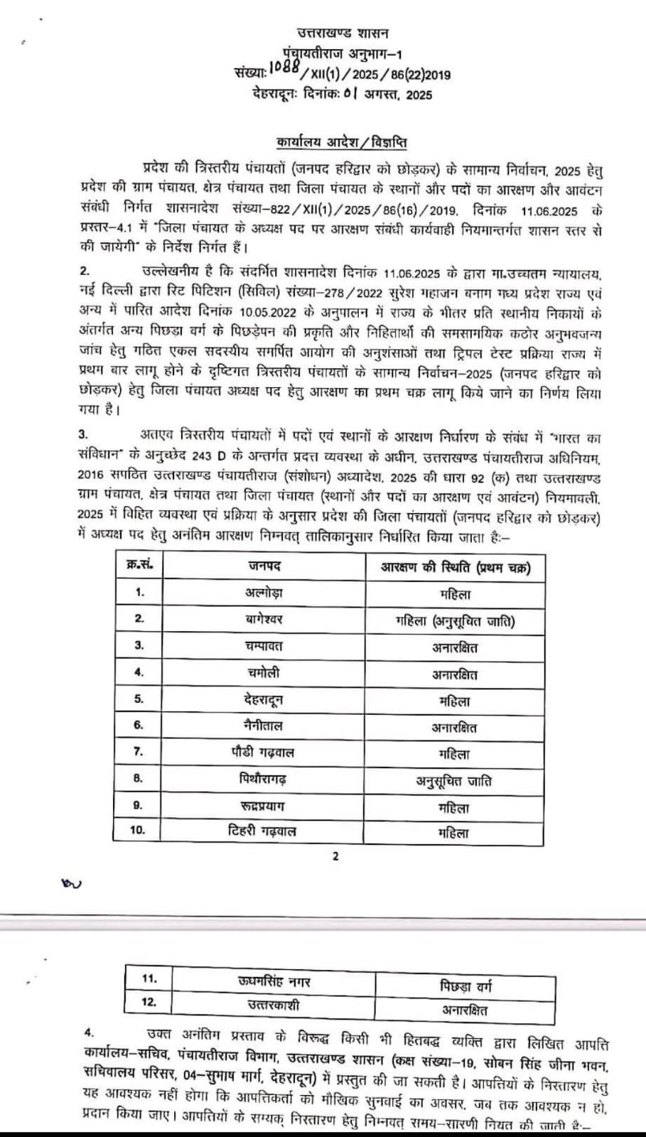 देहरादून : राज्य सरकार ने त्रिस्तरीय पंचायत चुनाव 2025 (जनपद हरिद्वार को छोड़कर) के लिए जिला पंचायत अध्यक्ष पदों पर आरक्षण चक्र को अंतिम रूप दे दिया है। पंचायतीराज अनुभाग-1 द्वारा जारी शासनादेश (संख्या: 1088/XII(1)/2025/86(22)/2019 दिनांक 01 अगस्त 2025) के अनुसार, राज्य के 12 जिलों में आरक्षण की स्थिति स्पष्ट कर दी गई है। इस फैसले के तहत महिलाओं, अनुसूचित जाति, पिछड़ा वर्ग और सामान्य वर्ग (अनारक्षित) के लिए जिला पंचायत अध्यक्ष पदों का आरक्षण चक्र पहले बार लागू किया गया है।