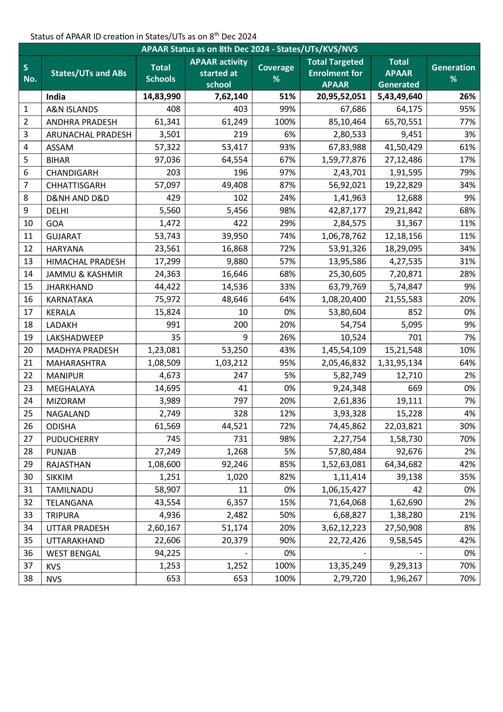 उत्तराखण्ड राज्य की स्थिति अन्य राज्यों की तुलना में अच्छी है तथा अद्यतन आँकड़ों के अनुरूप 42.2 प्रतिशत छात्र-छात्राओं को अपार आईडी सृजित करने के साथ राज्यों की यदि रैंकिग देखी जाये तो प्रगति के आधार पर उत्तराखण्ड सभी राज्यों में 8वें स्थान पर है। यदि इसमें जनपदों की प्रगति हम देखते हैं तो जनपद चमोली में 67.46 प्रतिशत, बागेश्वर में 64.83 प्रतिशत, पौड़ी में 62.79 प्रतिशत, अल्मोड़ा में 60.04 प्रतिशत, चम्पावत में 56.01 प्रतिशत, पिथौरागढ़ में 52.78 प्रतिशत एवं टिहरी में 51.89 प्रतिशत, की प्रगति अपेक्षाकृत अच्छी है, शेष जनपदों को अपनी प्रगति सुधारे हेतु निर्देश दिये गये हैं। विभाग द्वारा कार्यक्रम को शीर्ष वरियता देते हुये सभी खण्ड शिक्षा अधिकारियों एवं मुख्य शिक्षा अधिकारियों को निर्देश दिये गये हैं कि अपने विकासखण्ड/जनपद की प्रगति से प्रतिदिन अपने से उच्च स्तर के अधिकारी के साथ साझा करें तथा इसी क्रम में प्रतिदिन आँकड़े साझा किये जा रहे हैं।