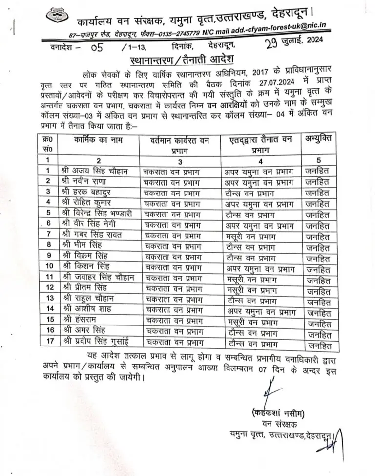 यमुना वृत के वन संरक्षक कहकशां नसीम ने एक साथ कई वन दरोगाओं और वन आरक्षियों के ट्रांसफर आदेश जारी किए हैं। सभी को तय समय में अपने नवीन तैनाती स्थल पर ज्वॉइन करने के निर्देश दिए गए हैं।