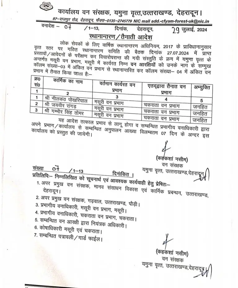 यमुना वृत के वन संरक्षक कहकशां नसीम ने एक साथ कई वन दरोगाओं और वन आरक्षियों के ट्रांसफर आदेश जारी किए हैं। सभी को तय समय में अपने नवीन तैनाती स्थल पर ज्वॉइन करने के निर्देश दिए गए हैं।