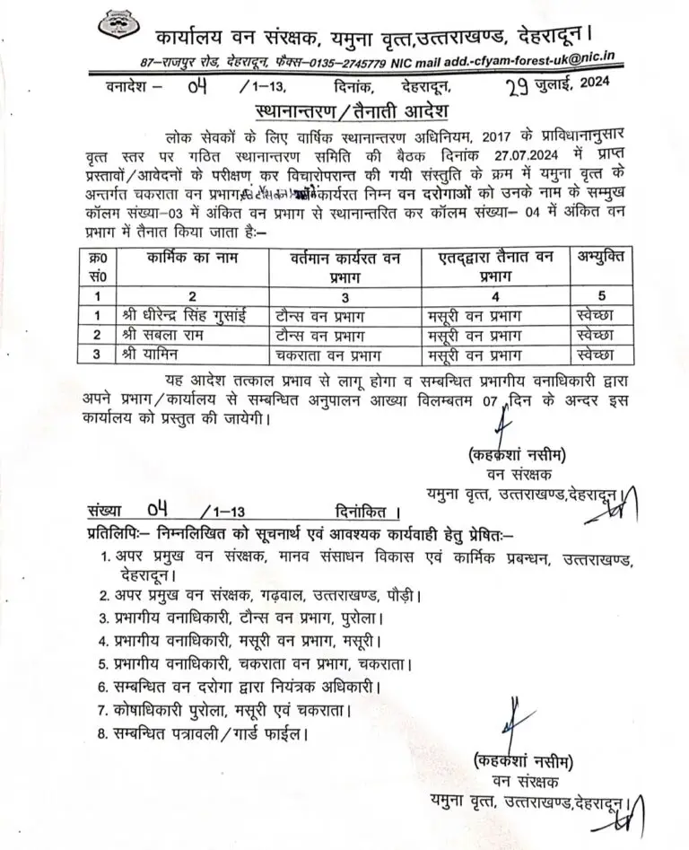 देहरादून : उत्तराखंड वन विभाग में पिछले कुछ दिनों से लगातार तबादलों का दौर जारी है। वन विभाग की लगभग सभी राज्यों के अधिकारियों और कर्मचारियों के तबादले किए जा रहे हैं।