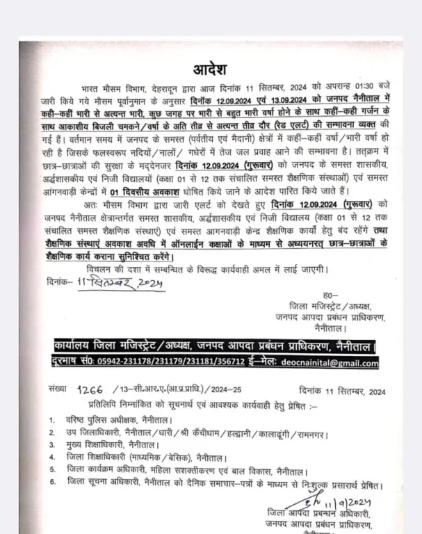 मौसम: मौसम विभाग के भारी बारिश के अलर्ट को देखते हुए चमोली और बागेश्वर जिला प्रशासन ने सरकारी व गैर सरकारी विद्यालयों में एक से 12वीं तक की कक्षाओं में अवकाश घोषित कर दिया है। आंगनबाड़ी केंद्रों में भी अवकाश रहेगा। मौसम विज्ञान केंद्र के निदेशक बिक्रम सिंह ने बताया कि उत्तराखंड में मानसून की विदाई की आधिकारिक तिथि 15 सितंबर है। इससे पहले प्रदेश के पर्वतीय जिलों के साथ मैदानी इलाकों में भी कहीं-कहीं भारी बारिश होने के आसार हैं। 14 सितंबर तक संवेदनशील इलाकों में रहने वाले लोगों को अधिक सतर्कता के साथ रहने की जरूरत है। उनका कहना है कि आवश्यक न हो, तो यात्रा करने से भी बचें।